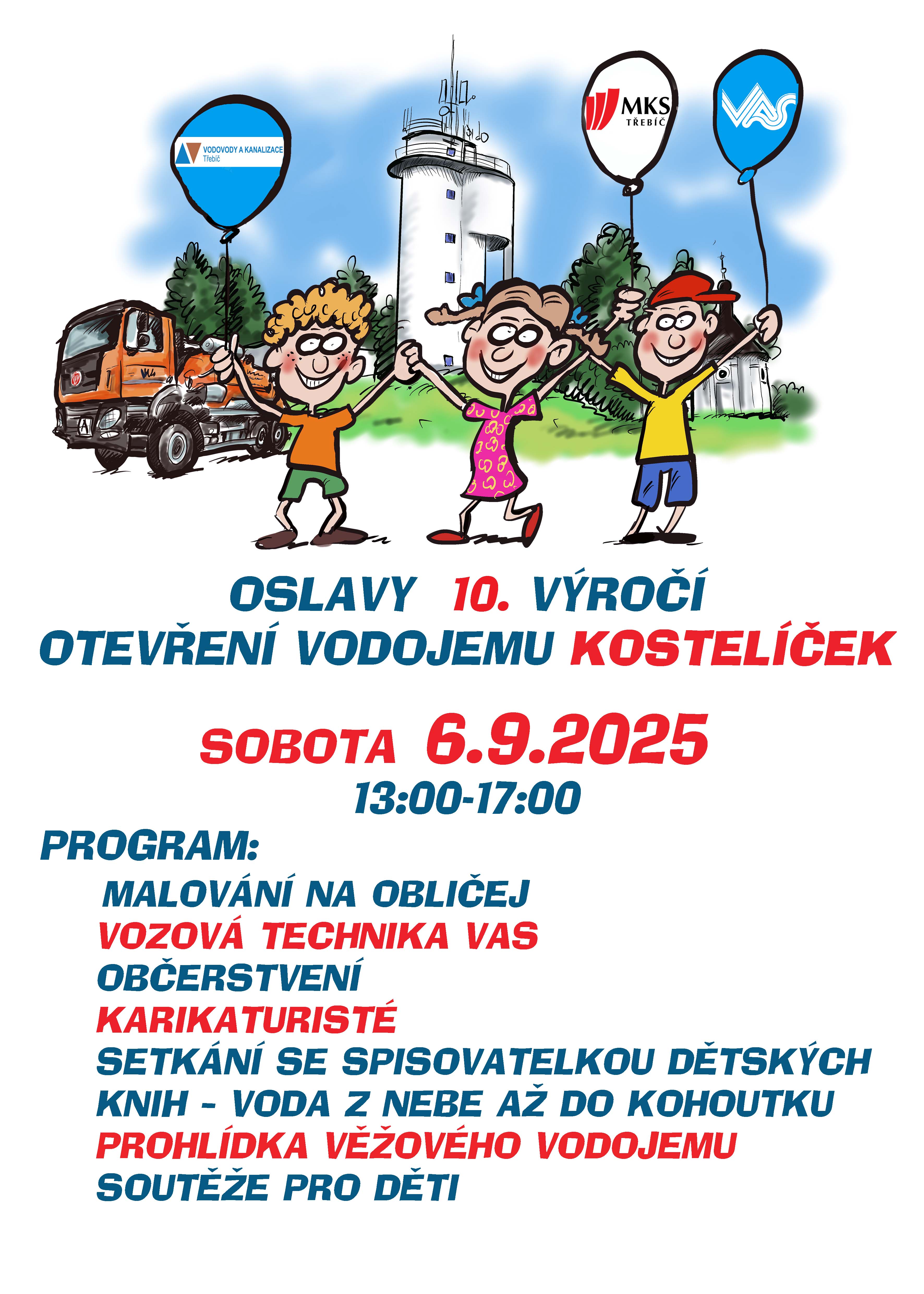 V sobotu 6. září 2025 se koná oslava 10. výročí otevření vodojemu Kostelíček. Od 13:00 do 17:00 je připraven bohatý program, který zahrnuje malování na obličej, ukázku vozové techniky, občerstvení a vystoupení karikaturistů. Děti se mohou těšit na soutěže a také na setkání se spisovatelkou dětských knih, která představí svou knihu "Voda z nebe až do kohoutku", a prohlídku věžového vodojemu.Pozvánka_-_Oslava_10._výročí_otevření_VDJ_Kostelíček.jpg Typ: JPG obrázek, Velikost: 911.99 kB
