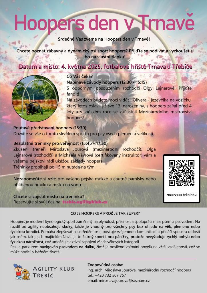 Zveme vás na Hoopers'dem v Trnavě, kde si můžete vyzkoušet dynamický psí sport hoopers. Akce se koná 4. května 2025 na fotoalovém hřišti Trnava u Třebíče. Těšit se můžete na závody, představení tohoto skvělého sportu a bezplatné tréninky pro veřejnost, které povedou zkušení trenéři. Nezapomeňte si vzít pamlsky pro své pejsky a rezervujte si místo na tréninku.HOOPERS_DEN_V_TRNAVĚ_-_jpg.jpg Typ: JPG obrázek, Velikost: 3.79 MB